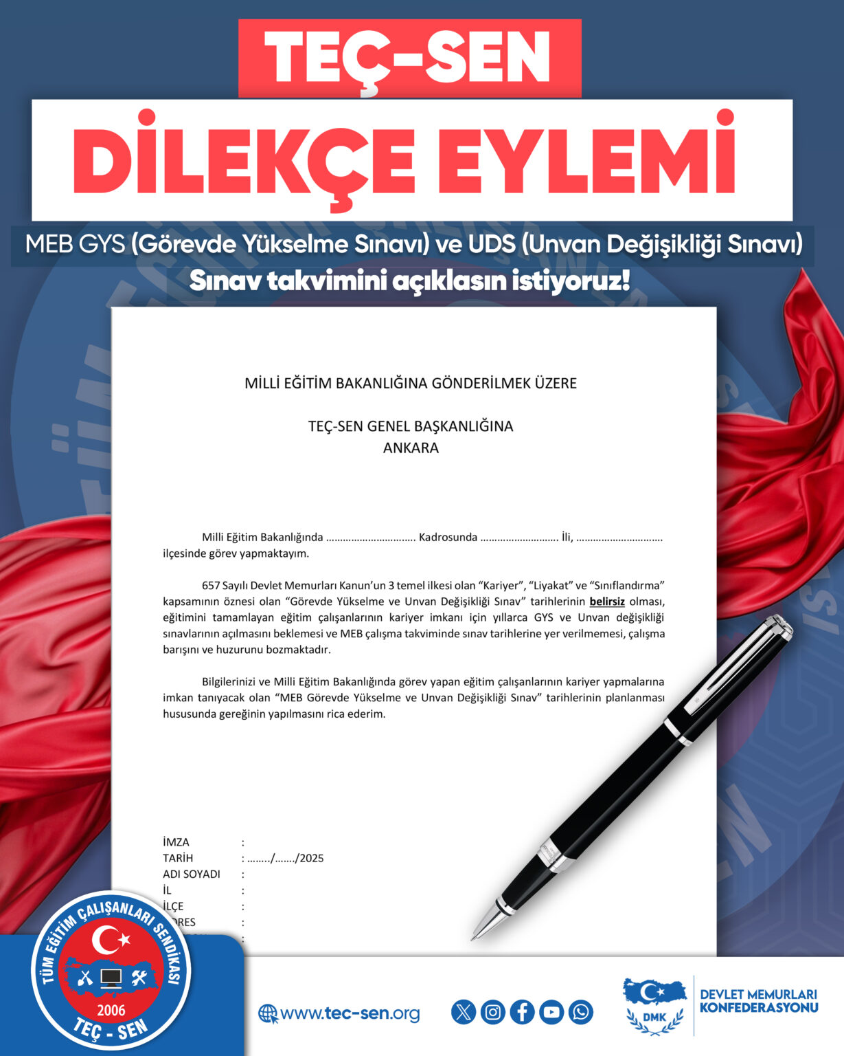 Milli Eğitim Bakanlığı’nda yıllardır beklenen Görevde Yükselme (GYS) ve Unvan Değişikliği (UDS) sınavları bir kez daha gündemde.TEÇ-SEN, binlerce eğitim çalışanının sesini duyurmak için büyük bir kampanya başlattı:📄 “GYS ve UDS…