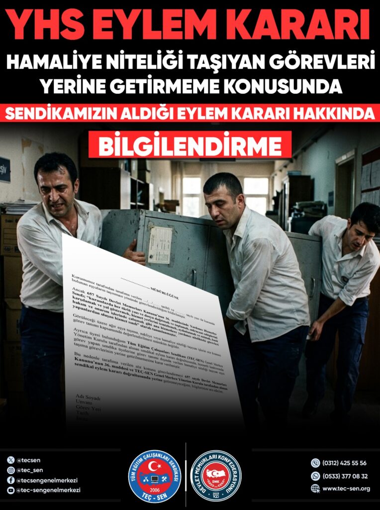Yardımcı Hizmetler Sınıfı (YHS) personeline görev tanımları dışında ağır yük taşıma ve nakliye işleri verilmesine yönelik uygulamalar, sendikal gündeme taşındı. TEÇ-SEN, söz konusu uygulamalara karşı eylem kararı aldığını duyurdu.